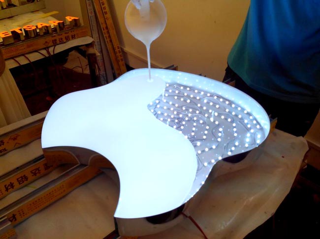 LED樹脂發(fā)光字是由外殼、填充原料、發(fā)光源三部分組成。是由調(diào)制好的樹脂倒入預(yù)先制好的模具里固化成型的,僅這個(gè)模具上,得考驗(yàn)產(chǎn)品的外觀是不是美觀和標(biāo)準(zhǔn)。并且模具成本方面不能太高以及制作方便快速。固化后脫模修整裝燈了。